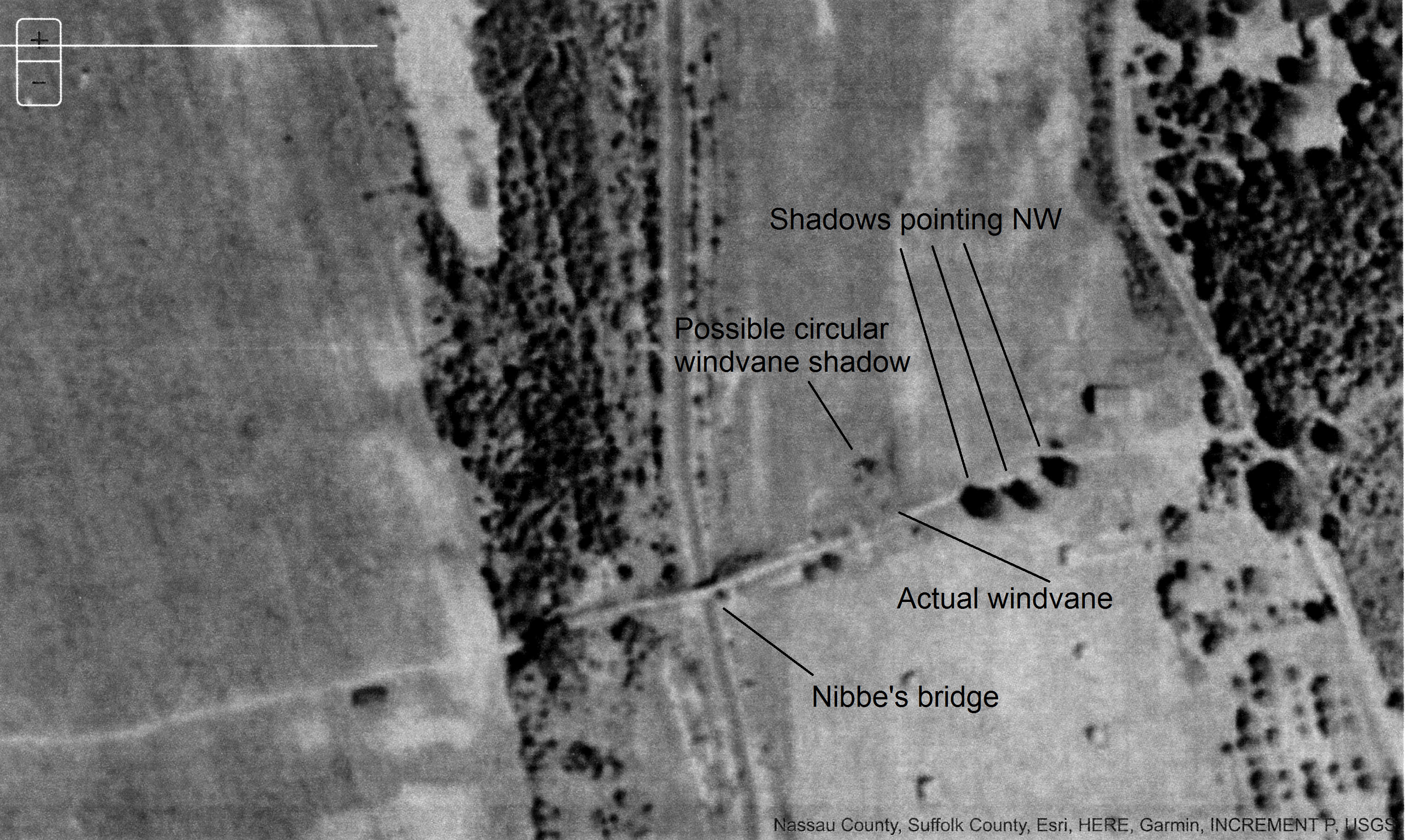 * ID Location/Orientation/Rationale: I decided that the photo was taken from the farm way road, east of the soon to be Nibbe Farm Way Bridge over passing the LIMP. On the Noel Gish Postcard Collection Blog here 10/22/2011, there’s a postcard titled “Motor Parkway through Nibbe’s Hollow. Central Park L.I.” You can see buildings & a wind vane or wind mill east of the Nibbe Bridge. The wind vane or wind mill has a square structure built around it. The wind vane in the mystery image doesn’t appear to have a structure around it. The stakes on the farm way road are likely center line markers for the bridge. The 4 poles that are west of the bridge & limp could be for telegraph/telephone service to the buildings, possibly west from Broadway. 1926 LRV aerial map shows the farm way road extending west to Broadway and east to Plainview Rd.
