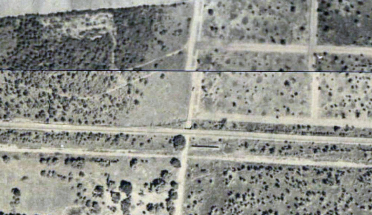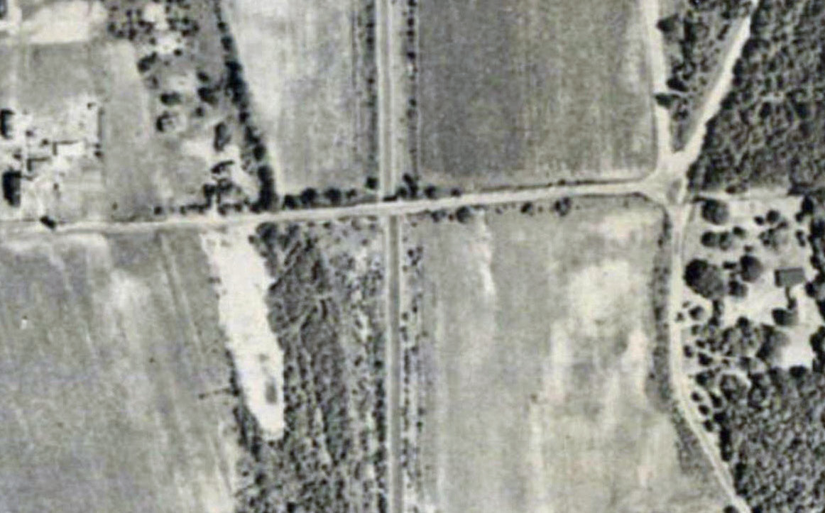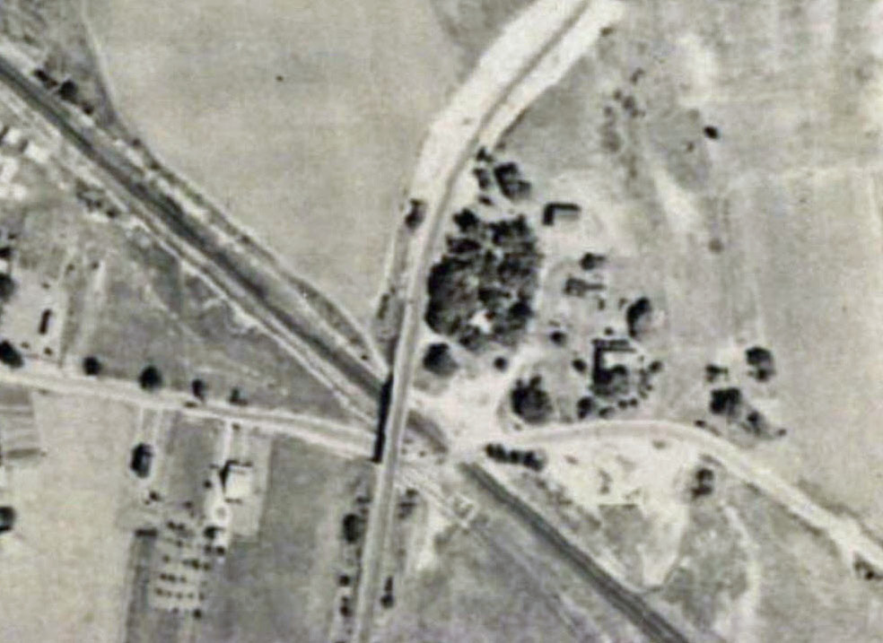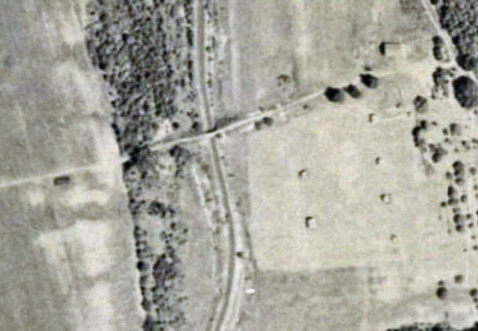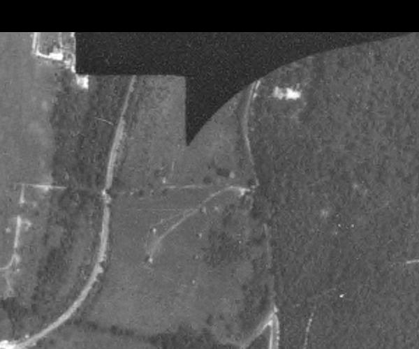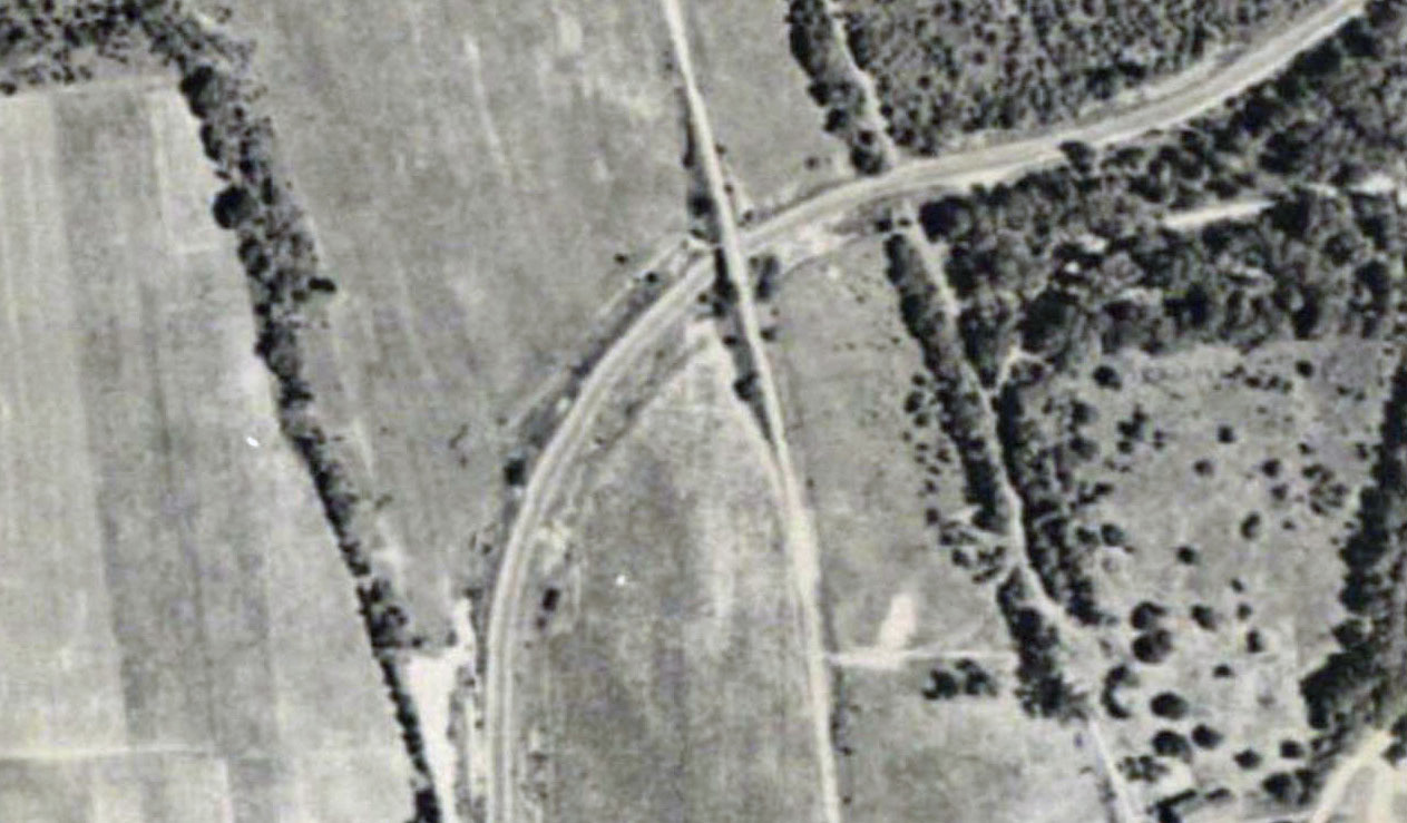 Oh, sibling! Most of the aerials (undated and blurry!) are completely unrelated. We’re on the RoW centerline, looking at the back end of an abutment fill, with a huge tree and a house with a two-level roof aligned with the RoW. That knocks out all but Nibbe as far as I can tell. If the Nibbe pic is oriented N-S, we’re facing ENE. Sam, III
