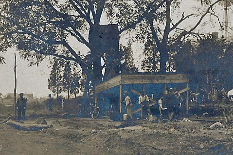 The Mystery Foto shows the Massapequa-Hicksville Road Motor Pakway Bridge under construction with the photographer looking west toward the Massapequa Lodge. The rationale is the exact match of the home with the wind-powered waterpump seen in the Mystery Foto with a 1909 image submitted by Greg O. The two-level building can also be clearly seen in the 1926 aerial of the area. As indicated by early Belcher-Hyde maps, this area was known as "West Central Park".