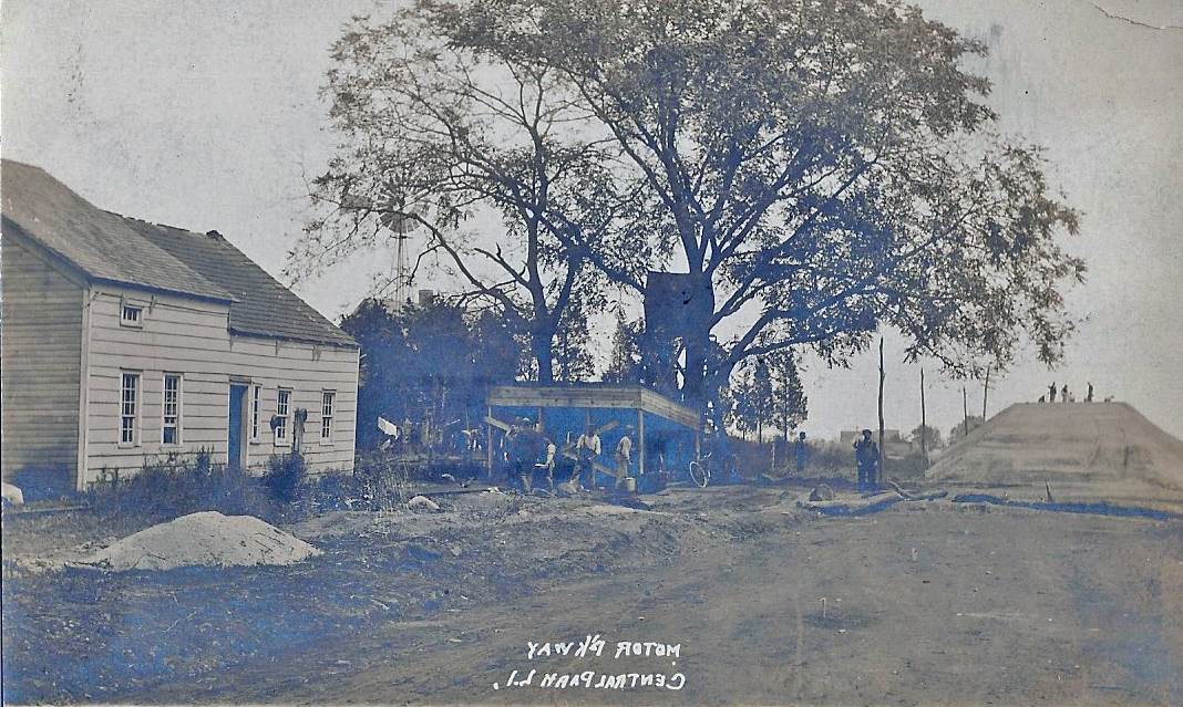 I think we’re looking north on Plainview Road during construction of the bridge over the LIMP in 1908. The road in the foreground (all dirt) does not resemble the actual LIMP under construction so I think it could be the straightened out section of Plainview Road that was moved slightly west of the “old” Plainview Road. Since the bridge appears to be almost completed, I would expect the LIMP pavement to have been completed previously if it was in fact the LIMP. The building on the right looks like the rear of an old residence, which means the front could be facing “old” Plainview Road as it would be. Also, I don’t think the LIMP right-of-way would have been that close to a residence. Also, if the “Central Park” notation is accurate, then the only “highway bridge” in the vicinity is Plainview Road.