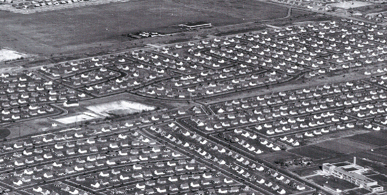 This is a picture of Levittown. The photographer is facing northeast hovering over the Wantagh parkway which is at the bottom of the picture. Hempstead tpke runs from the bottom left to the top right of the photo. In the top left area of this picture the undeveloped land is the Long Island Aviation Country Club and has not yet been built over with Levitt homes when this picture was taken. The LIMP runs along the southern border of this property. Since some ranch style Levitt homes in this photo are shown as completed, (homes north of Orchid rd and east of Jerusalem ave) this picture should date around 1949.