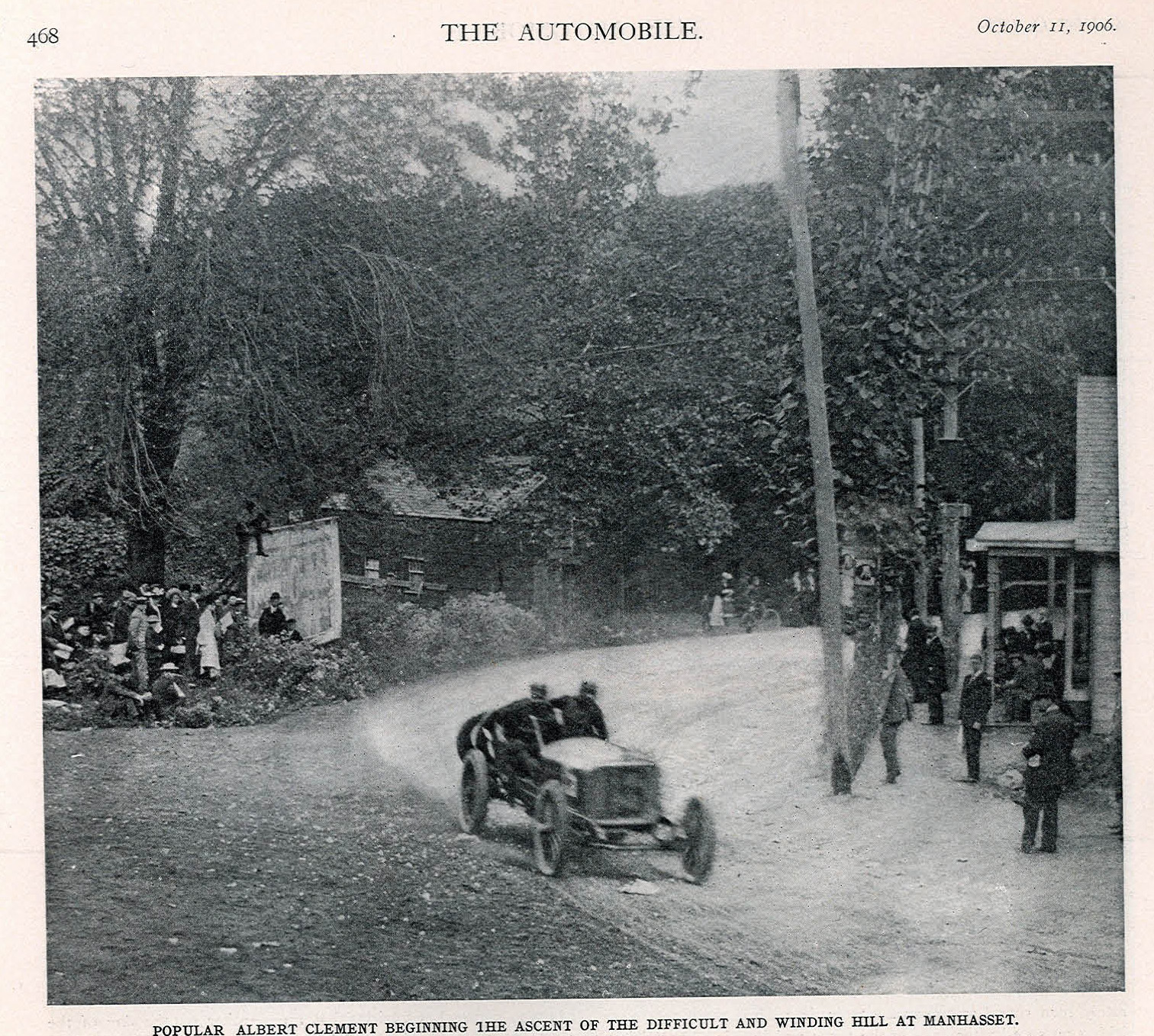 The photographer is facing east (maybe slightly northeast) on Northern Blvd. at Valley Road in Manhasset as Vincenzo Lancia in the #4 FIAT is about to go west up Spinney Hill in the 1906 Vanderbilt Cup Race. Lancia’s mechanician was Ajassa Batista (or possibly Batista Ajassa). I think I read somewhere that the building served as the local jail at the time. As near as I can tell, it looks like everyone is wearing some kind of head covering.