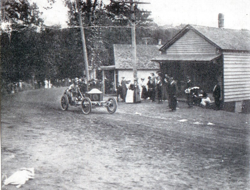 I’d say this is the 1906 Vanderbilt Cup Race with Fiat #4 being driven by Vincenzo Lancia. His mechanician was Battista Ajassa. This is the stretch heading west into Manhasset Hill. (Today that would be the intersection of Northern Boulevard and East Shore Road/Community Drive.) The photographer is likely on the west side of the road looking east. The shop is most likely the blacksmith shop. Wasn’t a young boy killed at this intersection that year? Oh, no one is without a hat.