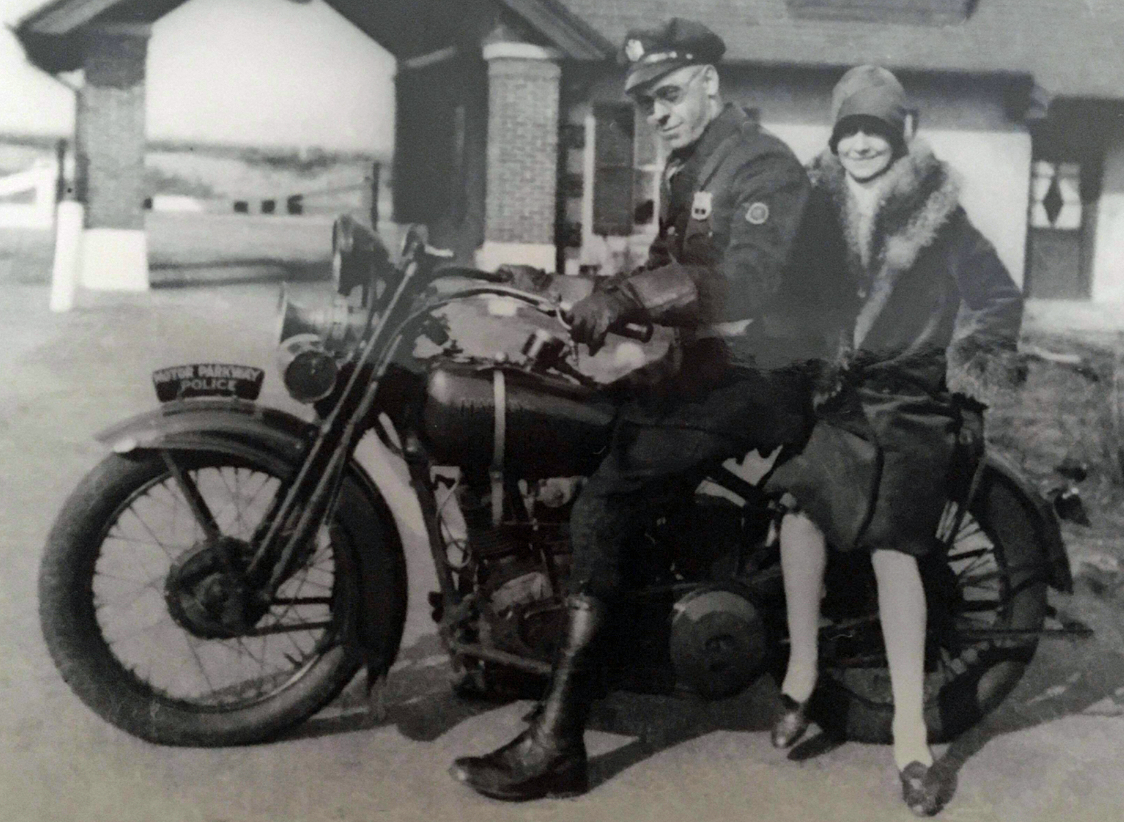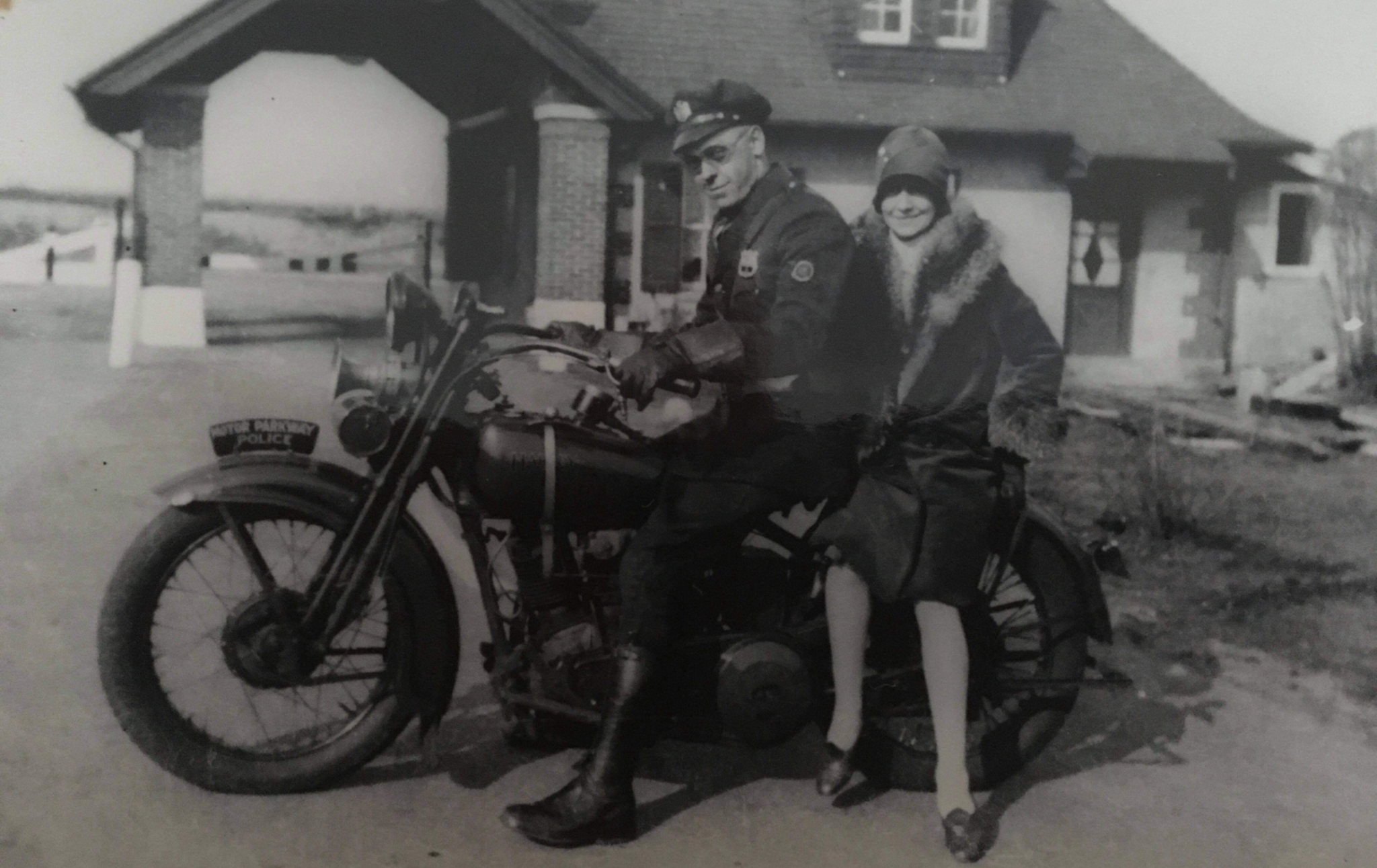 I’m late to this one, so here’s my guesses- This really appears to be at the Meadowbrook Lodge, photographer facing west. Going by another photo, he doesn’t resemble Thomas Zinzi. He may be Eric Ericson, he and Thomas were police for the LIMP. I would assume that Eric would patrol Suffolk, Thomas in Nassau. Sure they crossed borders and helped each other out. Maybe the woman is Mrs McCamish and Otto took the photo.Just made out the make, Harley Davidson.