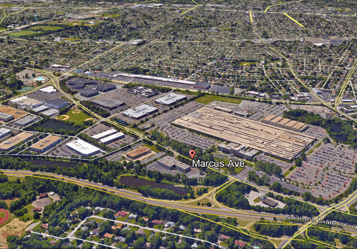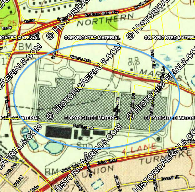 The view is looking southeast, with the road running diagonally top left to lower right just below the circle being Marcus Avenue. Left to right across the bottom is the Northern State Pkwy. It looks like a LIMP overpass at the lower right, just to the right of the Lakeville Rd. Overpass.