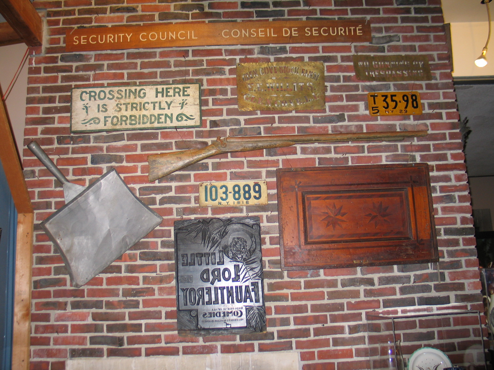 Top item mounted on wall in photo is a wood sign (Security Council) used at the UN when located in the Sperry Building at Lake Success. Removed and saved by Sperry President Preston R. Bassett and later given to the Nassau County Museum (NCM #64.17.3). Bassett’s office had been used as the U.N. Secretary General’s office during their stay at Sperry. Shown when exhibited at Old Bethpage Village Restoration back in October 2006 as part of a special exhibit “Selections from the Collections of the Nassau County Division of Museum Services” that I setup.