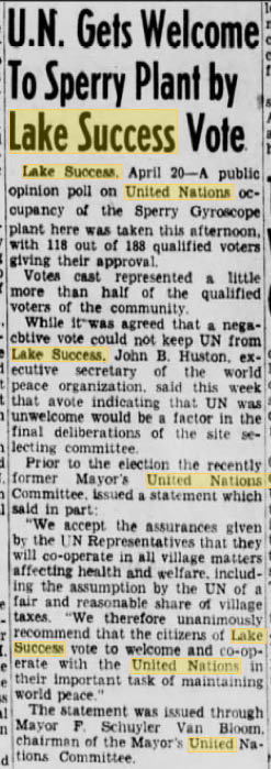 I don’t know the date but by 1952, Olive St. would be showing in the lower left corner (though without houses yet). Also that’s the original eastbound NSP Lakeville Rd exit starting right at the bridge out to Marcus Av. At some point, between 1950-52, it was moved about 500 feet further east.* If (??) the UN took over an existing Sperry headquarters building, then I’d guess the pic is during or right after WWII (hence the ‘CONFIDENTIAL’ ??) so maybe 1945,6,7.