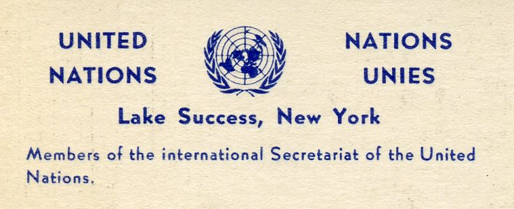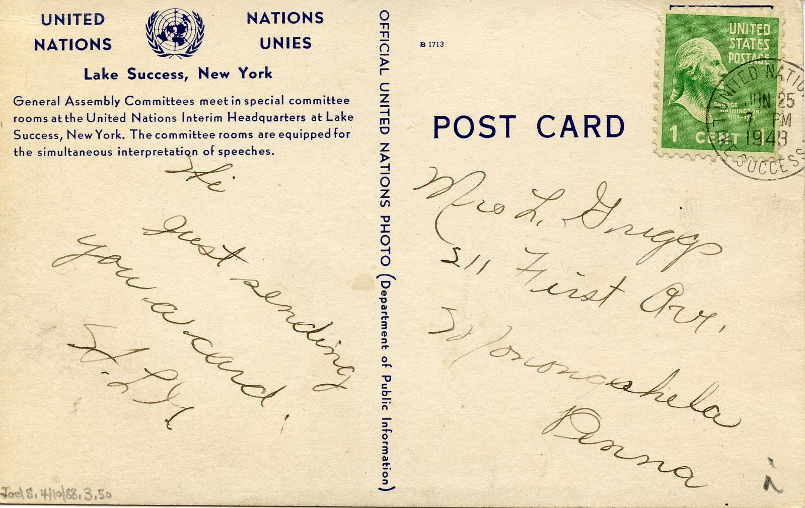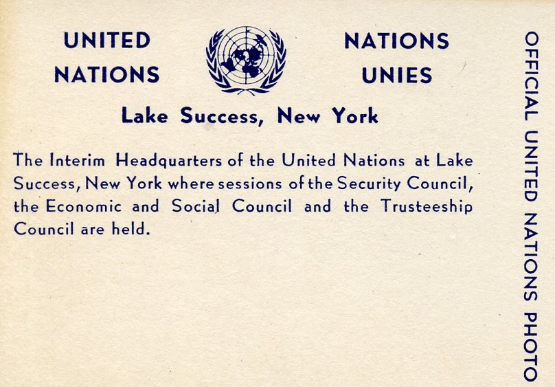 Reverse caption for above postcard, including the “United Nations / Lake Success” cancellation