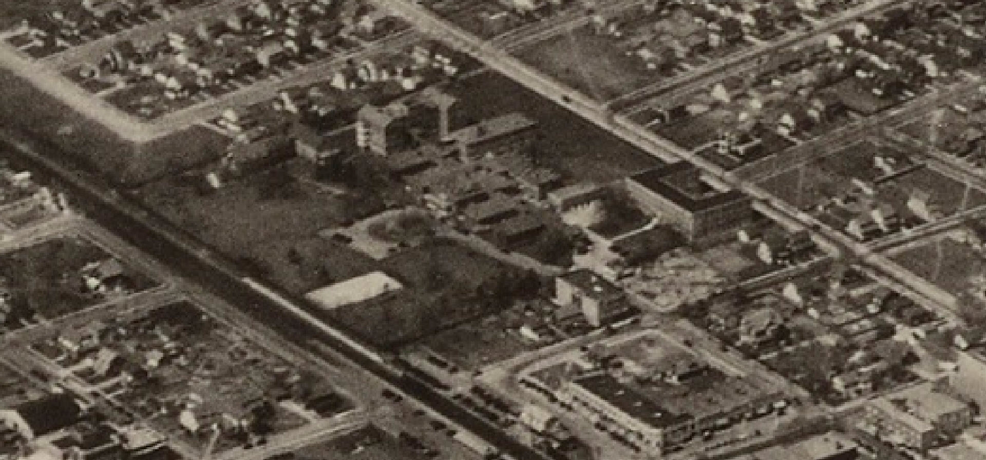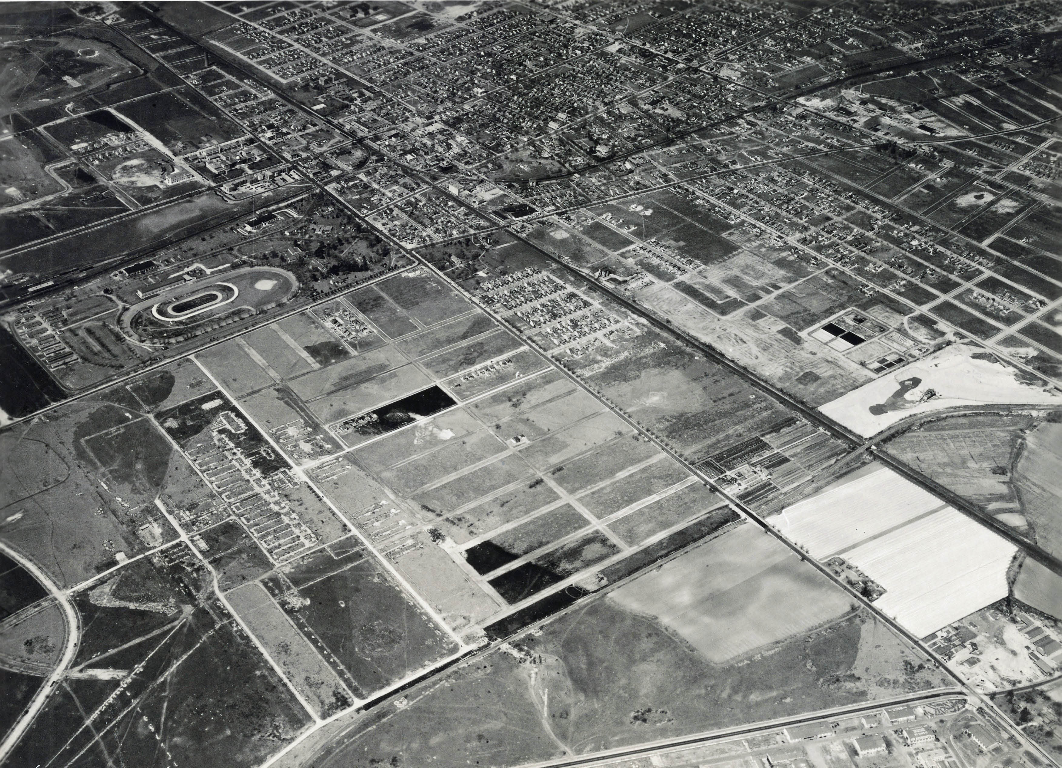 Aerial photo over Garden City,at edge of Roosevelt field, facing west.
