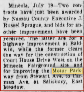 From bottom to top: Roosevelt Field hangars and buildings, Long Island Motor Parkway