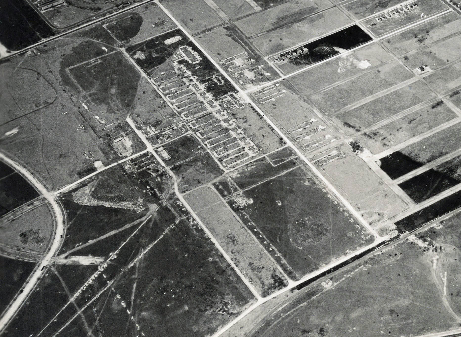 The aerial was taken in April 1931. Rationale: The buildings of the Mineola Fairgrounds were demolished in 1951and the status of the Garden City housing developments.