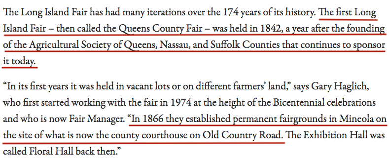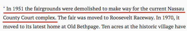 Additional info - The Queens-Nassau Agricultural Society sold the site where the Nassau County Courthouse currently is to Nassau County in 1938. As part of the agreement, Nassau County was to take over all of the grounds as a civic center and after the 1952 fair, the County used it for the rest of the buildings currently there today.