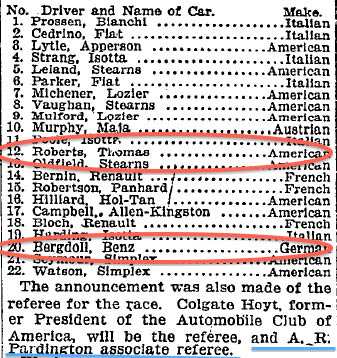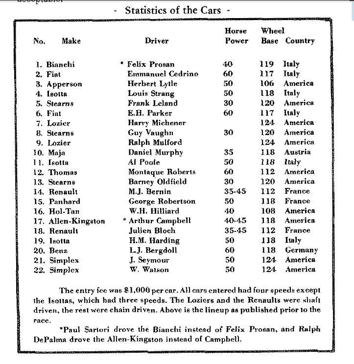 The race was held over a 30-mile Westchester course. The race was won by Louis Strang in a Isotta-Fraschini.