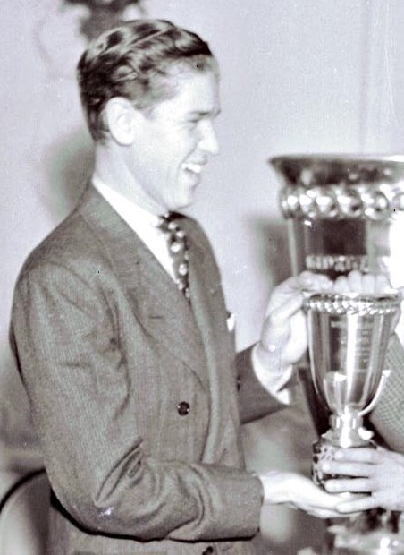 That’s George Vanderbilt on the left presenting Tazio Nuvolari with the trophy for winning the 1936 Vanderbilt Cup Race. The ceremony probably took place on October 12, 1936, the day of the race at Roosevelt Race Tack in Westbury. I believe both trophies were manufactured by Cartier. The large cup in the background is in the Museo Nicolis in Verona, Italy. Not sure about the small cup that is being held by Vanderbilt; maybe it’s still in the possession of the Nuvolari family.