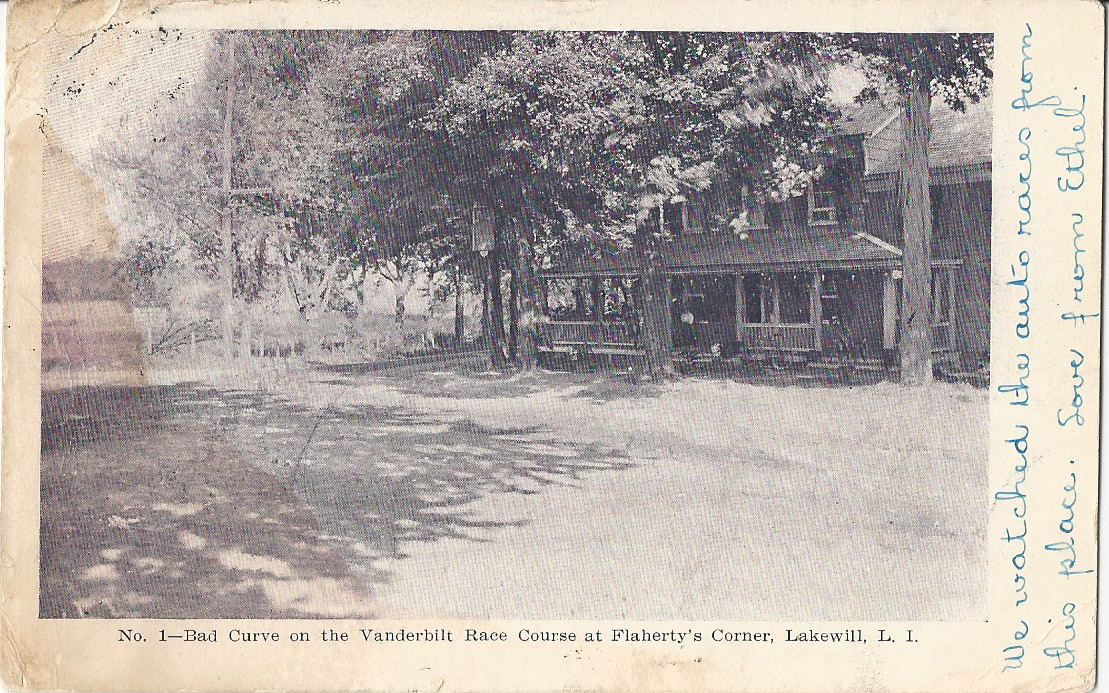 The building was the Lakeville Hotel owned by Frank Flaherty (also referred to as Lakeville Inn). Flaherty's Corner was on the course for the 1905 Vanderbilt Cup Race (racers came west on I.U. Willets Road and head south on Lakeville Road) and the course for the 1906 Vanderbilt Cup Race (racers came south on Lakeville Road and turned east on I.U. Willets Road).