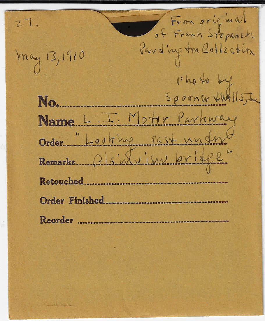 I think that’s the Plainview Road bridge in Central Park (Bethpage) and the photographer is looking east. Plainview Road is on top with the LIMP going through the bridge. Maybe the LIMP corporation or Willie K. himself employed the photographer to take promotional photos. Since there is no “Please Be Careful” warning on the abutment, the date must be before 1930. Along with style of automobile in the photo, I’ll guess the date around 1920.