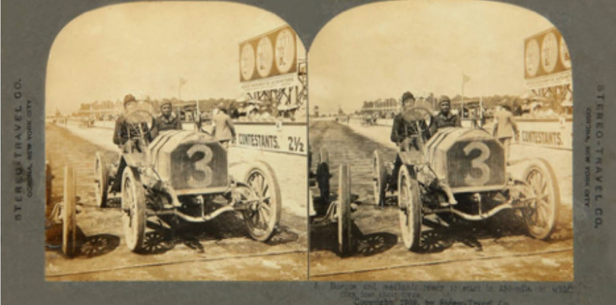 The Stereo-Travel Company was a specialty photography company that produced images for use in a device called a stereoscope or stereo viewer. There were many companies that produced them from around 1890 - 1915 and when placed in the viewing device (see attached photo) allowed the user to see it in 3-D. They were usually sold in sets of between 50 and 100 cards for each topic. The Stereo-Travel Co. issued a set in 1912 related to the Indianapolis Motor Speedway so I’m guessing this mystery card is from that set which probably included scenes from various events held there from 1909 through 1911.