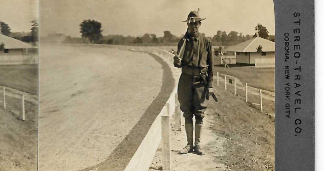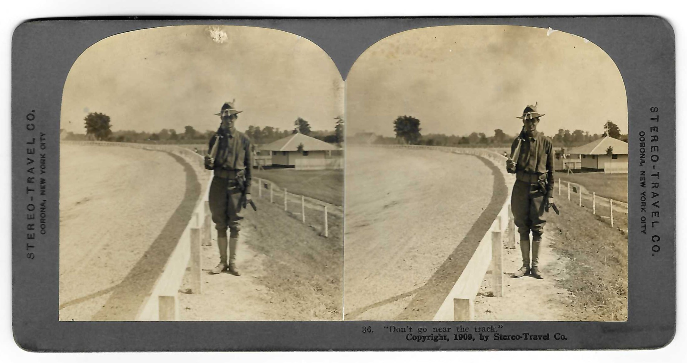 Great mystery photo! The track is Indianapolis Speedway and the race was August, 1909. The Stereo-Travel Company produced a set of 40 stereo cards documenting the first automobile races at Indy. The attached documentation provides more detail and the source (.(JavaScript must be enabled to view this email address)) has compiled a list of all 40 cards (I’ve included stereo card #36 of which the mystery photo is marked). Other attached photos are from the Detroit Public Library Digital Collection and clearly show the wooden building, fences and trees in the mystery photo. Tents are shown which aren’t in the mystery photo so presumably the tents were put up a few days after the mystery photo was taken. The Guard is a member of the Indiana National Guard.