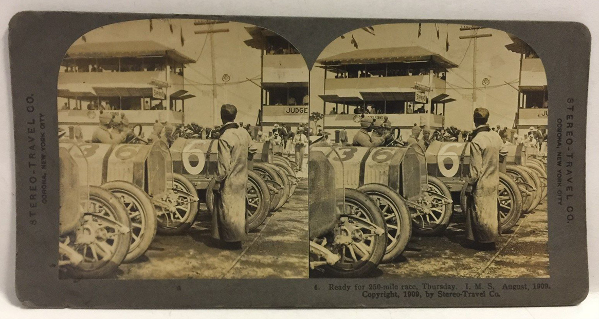 This is photo #36 of 40 taken during the very first race at the new Indianapolis Motor Speedway August 19th - 21st, 1909 prior to the speedway being paved with bricks. The Stereo-Travel Co. of Corona, New York City produced 40 stereoviews of the opening race meet. The bottom right of the stereoview says “Don’t go near the track” with a copyright of 1909. Place the stereoview card in a stereoscope which will presents two slightly different images separately to the left and right eye of the viewer. These two-dimensional images are then combined in the brain to give the perception of 3D depth. 3D photos! Attached is my overview of the first Indianapolis Motor Speedway race meet.