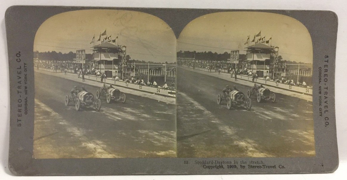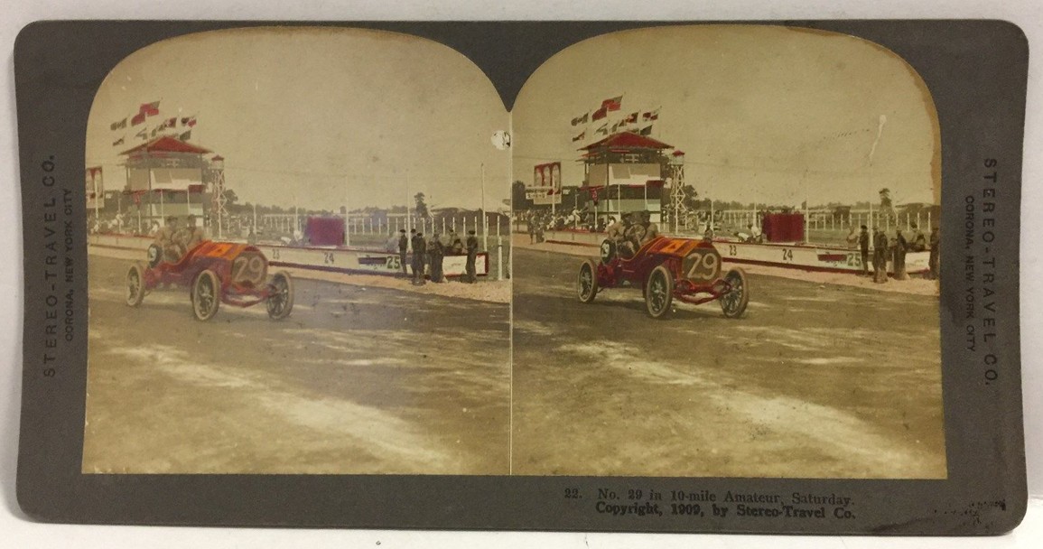 This rare 40-card stereo set documents the first races held at the Indianapolis Speedway August 19-21, 1909. The rectangular 2 ½ mile racetrack was built at an estimated cost of $650,000 by a group of local businessmen on 328 acres about 5 miles northwest of Indianapolis, Indiana. The track included two long and two short straightaways and was initially paved with a mixture of crushed rock and tar. After the races, issues with the surface led to resurfacing the track with over 3 million paving bricks, and the track became the famous “Brickyard” a few months later – in December 1909.