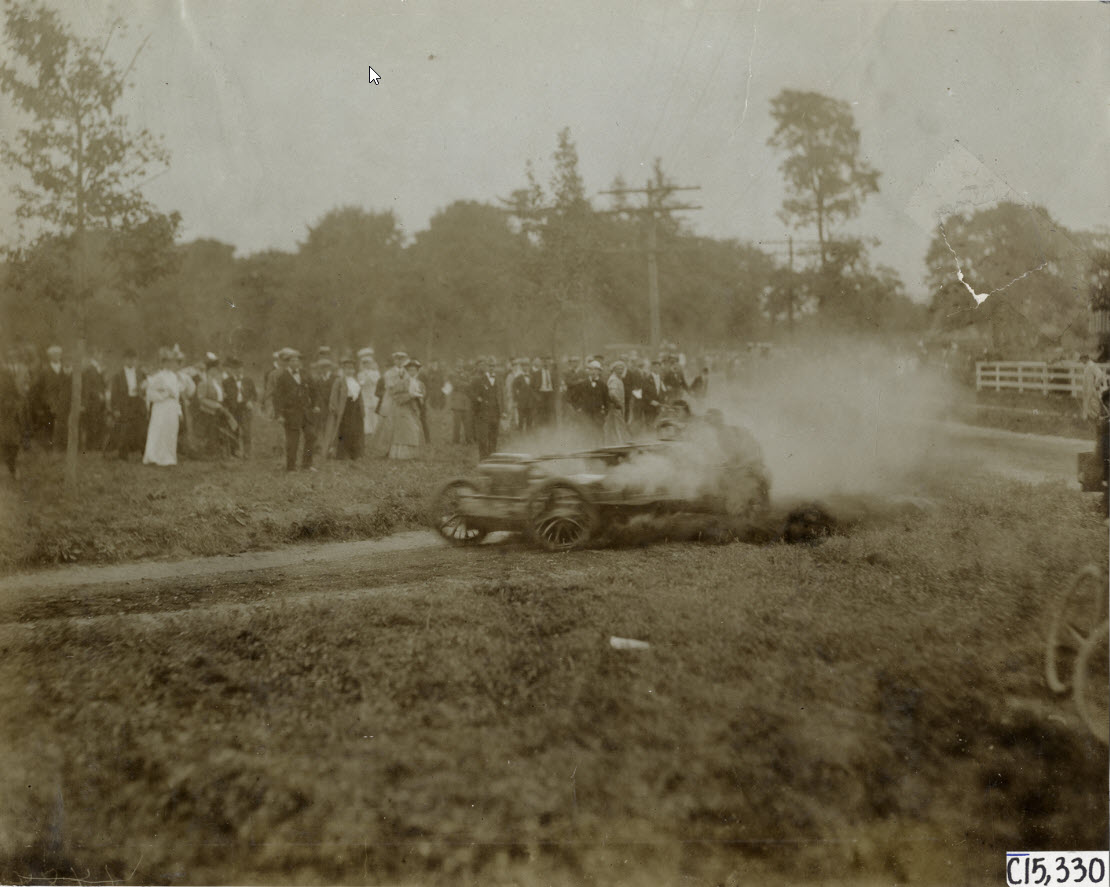 I think that’s J. Walter Christie driving his stripped down 50 HP Touring Car in the 1906 American Elimination Trial, on September 22, 1906. He had crashed his racer in a test run the day before. I think the photographer is facing north or slightly north-east as Christie is turning on to Old Westbury Road at the hairpin turn in Old Westbury. Christie finished fifth, qualifying him for that year’s Vanderbilt Cup Race.