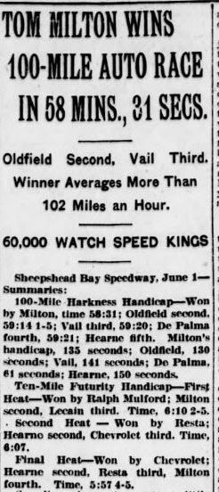 The date on top gave it away but still fun. June 1, 1918, 10 mile Futurity Handicap Stakes at Sheepshead Bay Speedway, Brooklyn (a two mile, 17 degree banked, wooden oval). Formally a horse racetrack owned since 1880 by the Coney Island Jockey Club, it was purchased in 1915 for $2.4M and converted to an auto speedway when horse gambling was banned state-wide in 1910. A 430 acre site bounded by Ocean Av, Gravesend Neck Rd, Voorhees Av, and Cedar Woods (Knapp St), a park for auto races, car shows, air shows, and athletic contests of various kinds. The park was short-lived and closed Sept 1919.