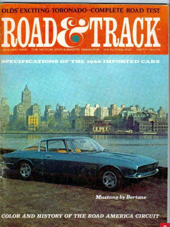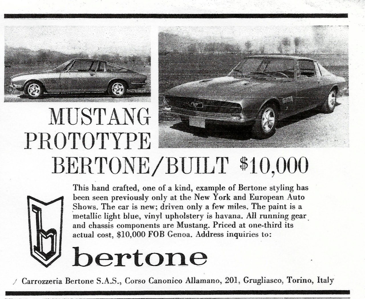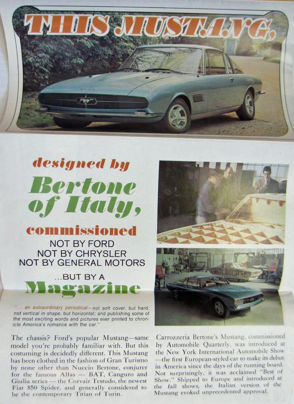 Ccommissioned by L. Scott Bailey, the publisher and founder of the magazine “Automobile Quarterly”. The article "Bertone Builds a Mustang" was featured in the Fall 1965 issue of Automobile Quarterly (Volume IV, Number 2)
