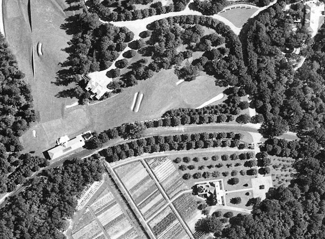 Major buildings are the main house, boathouse, chauffer’s quarters and the Hall of Fishes.