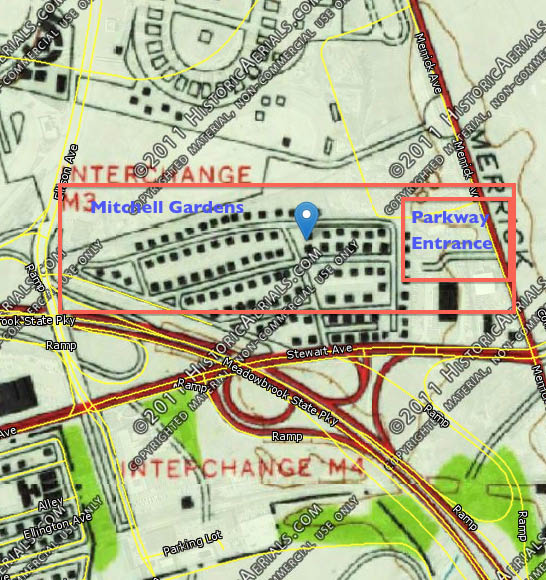 As seen in this 1960s aerial, there was no trace of Mitchel Gardens between Stewart Avenue and the Motor Parkway right-of-way after the Meadowbrook Parkway was opened.