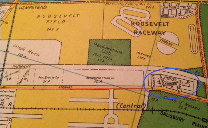1950’s Westbury looking NW at Roosevelt Raceway harness racing, with circular paddocks bottom right. Garden City and curvy Motor Pkwy on bottom left with twin bridge location site (future Merchant’s Concourse). Barely seen in the distance is LIMP’s Mayan Ruins, Old Country Rd hwy bridge, LIRR pkwy bridge, Westbury Ave pkwy bridge, Hillside Ave pkwy bridge into Wheatley Hills golf course. Need an electron microscope to go further. Garden City lodge and Clinton Ave bridge are out of view in top left. In the center looks like remnants of ‘30s Vanderbilt and ‘40s Roosevelt raceway grandstand, Meadowbrook polo club grounds middle left, Roosevelt airfield behind the polo grounds (remaining white aircraft hanger can be seen by Old Country Rd). Merrick Ave (Whaleneck Av) bottom right corner, Old Country Rd diagonal across the center, Clinton Rd-Glen Cove Rd (Guinea Woods Rd) furthest edge of Roosevelt airfield. Housing community is Mitchel Airfield base (northern airfield boundary) and just east of future Meadowbrook Pkwy. Main raceway in the center is original ‘40s racetrack, to the right is a practice track and future site of Sony Multiplex (part of this track was the original Vanderbilt motor raceway).