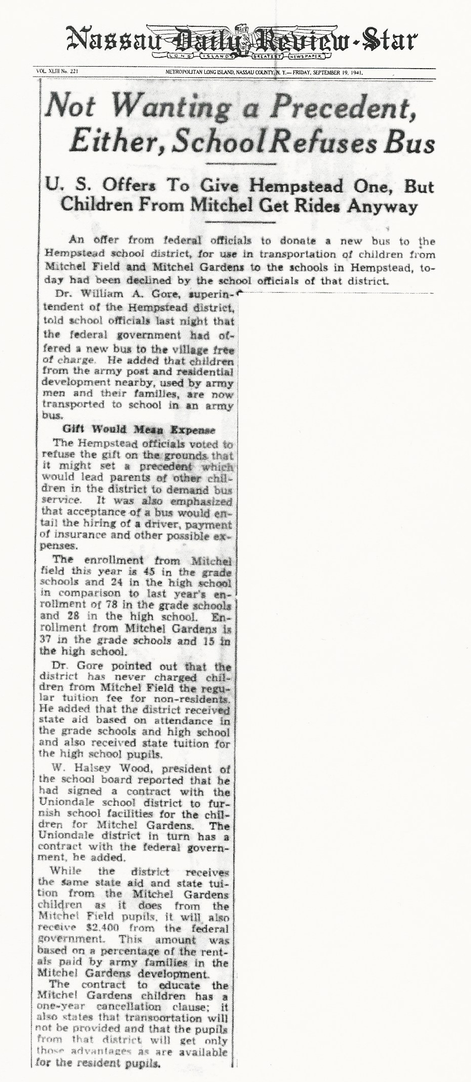 This meant there were civilian children at Mitchel Gardens going to Uniondale and/or Hempstead schools. The Federal Government subsidized the military kids going there and apparently NY State did the same for the civilian kids, at least until the Gardens was transferred to Air Force control in 1947 when there were nothing but military kids there.