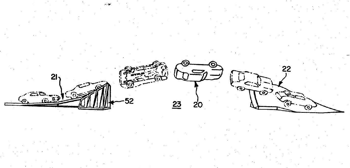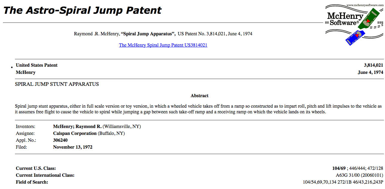 On November 13, 1972, "Inventor" Raymond McHenry of Calspan Corp. filed this patent for the Spiral Jump Stunt Apparatus. It was accepted on June 4, 1974.
