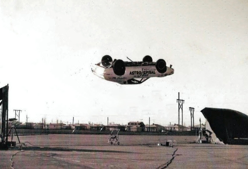 The car stunt was tested three times in 1971 at the Cornell Aeronautical Laboratory grounds grounds in Buffalo, New York using a modified 1972 AMC Javelin SST.