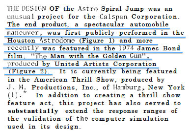Three manned jumps on CAL's apron followed the unmanned launches before the Astro Spiral was debuted inside Houston's Astrodome on January 15, 1972. Fifty thousand Texans went berserk at the incredible sight of a barrel-rolling Javelin, applauding and hollering. Among the race-suited ramp hands were McHenry and Milliken, arch-intellectuals given a rare moment in the limelight. The later jump for the James Bond cameras in Thailand was, according to Bill, one of the best they'd ever had. The resulting publicity was such that CAL's Ira Ross sold many more of McHenry's programs-giving a hint as to why Ross was willing to tolerate Milliken's less conventional initiatives.