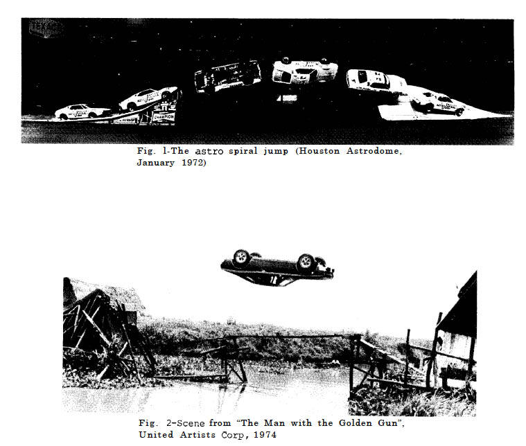 The science to the stunt first performed at the Astrodome in an AMC Javelin and was known as the Astro Spiral Jump and conceived and first completed by Jay Millikan. I recall reading about this back in the early 70’s. As I recall he was to perform 2 jumps however on the first jump the car lost oil pressure and was unable to start for a second attempt. So somewhere there is a famous Javelin that can’t start.