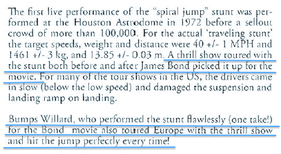 Stunt first performed prior to appearing in the film was 1972 in Houston Astrodome. The stunt name was “Astro Spiral Jump” or “Bond Corkscrew”.