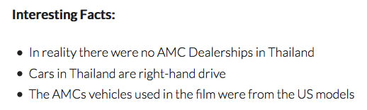 Stunt filmed in Thailand. Car is an AMC Hornet, driven by “Bumps” Willard.