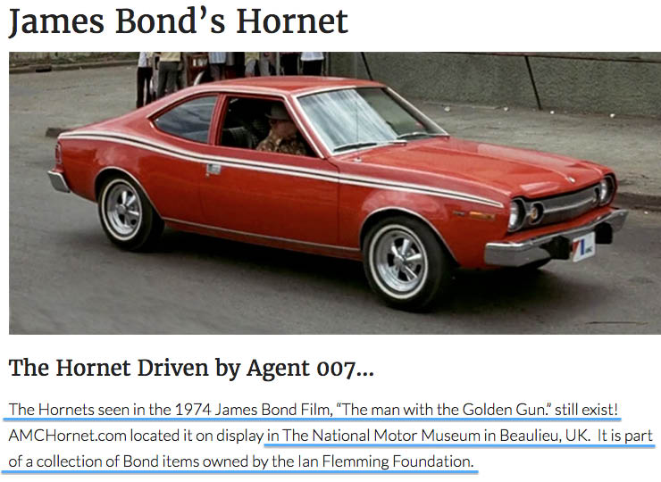 The car was an AMC Hornet. I subsequently read up on this stunt in Jalopnik and found all the relevant facts which you already have seen, so I won’t pretend that I know all of the details. I related what I thought were the most important.