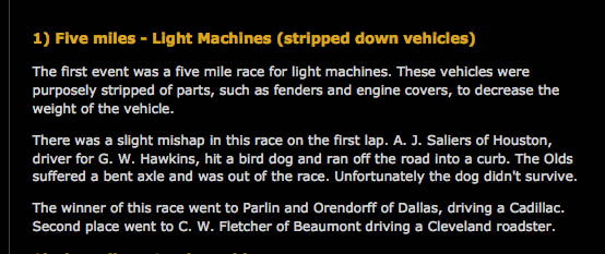 Unfortunately (for a dog and for Saliers) the car ran over a dog in the the first lap, bent an axle and left the race.