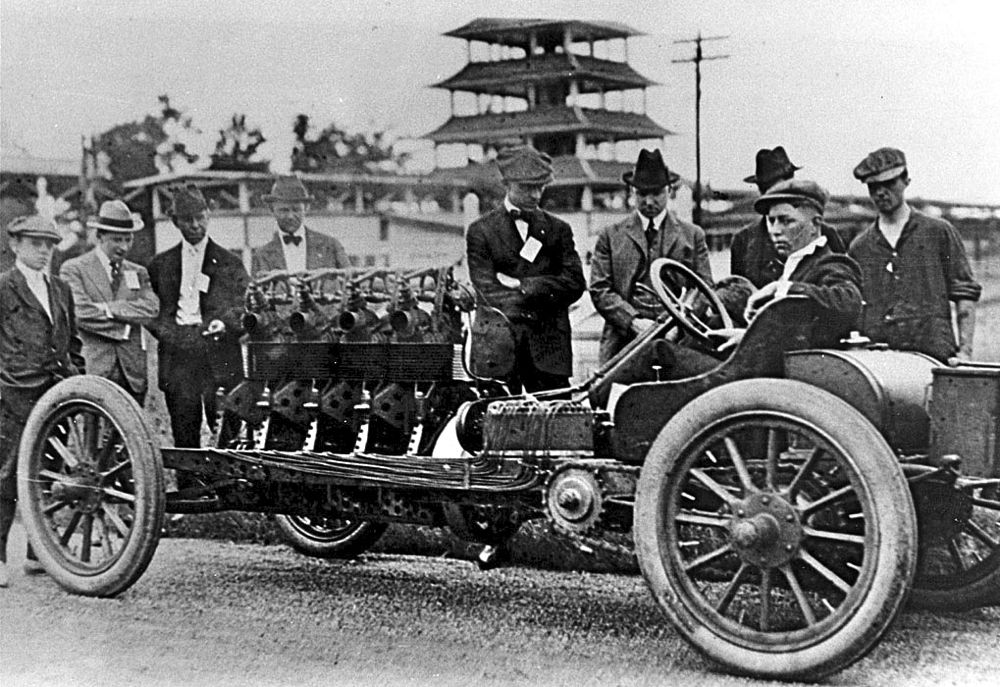 Carl Fisher’s commissioned (1903-1905?) year is debatable, Premier Racer for the 1905 Vanderbilt Cup Race but exceeded the weight limit for the race. Built by Premier Motor Car Company. air cooled, 900 cu.in., 2320 lbs. on display at Indianapolis International Motorspeedway Hall of Fame. Looks like AJ Saliers drove a Oldsmobile Hawkins in the first ever auto race in Houston, TX. in 1903, but ran over a bird dog which put him out of the race, not quite sure if this is the race that he ended up sitting in the Premier Racer?