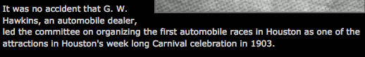 Didn’t have the time to look into it for too long, but it looks like all I could quickly find was A. J. Saliers was a driver for G. W. Hawkins driving an Oldmobile during the first auto races in Houston on Tuesday, November 24, 1903. He hit a dog and ran off the road into a curb. The Olds suffered a bent axle and was out of the race.
