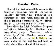A. J. Saliers was the driver of an Oldsmobile at what was listed as one of the first auto races in Texas, held in Houston on Tuesday, Nov. 24, 1903. The race was five miles for “Light Machines, Stripped”. Organizers included G. W. Hawkins, M. J. Lossing and S. H. Hart.