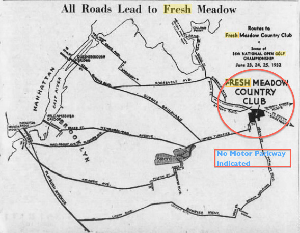 The Motor Parkway connected with Nassau Boulevard (World's Fair Boulevard, later Horace Harding Boulevard), seen on the far right.