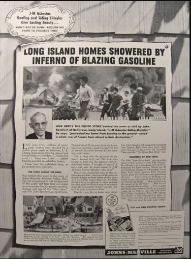 A sign of the differing times can be seen here. Considered unacceptable by today's standards 84 years later, asbestos companies back then seized upon the tragedy to advertise their products, stating that your home would have been protected by the combustible aviation fuel had your house been covered with asbestos shingles.