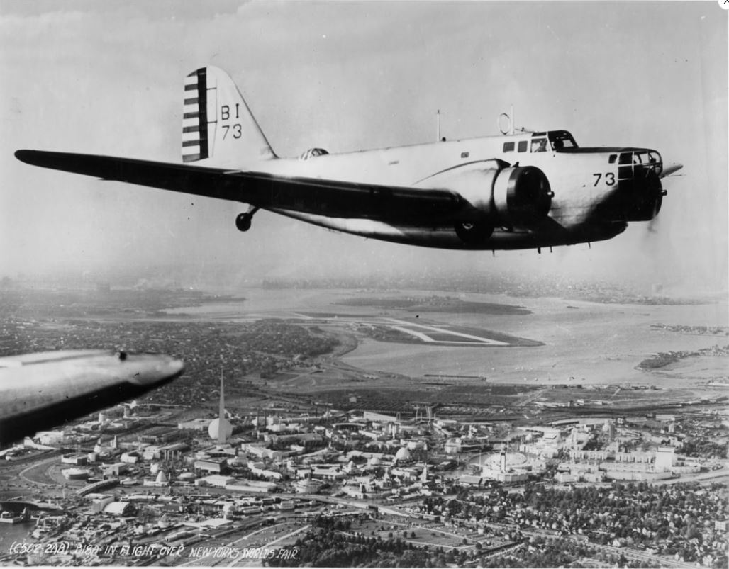 A B-18 Bomber like those of the accident as seen in 1939 flying over the World's Fair Grounds.