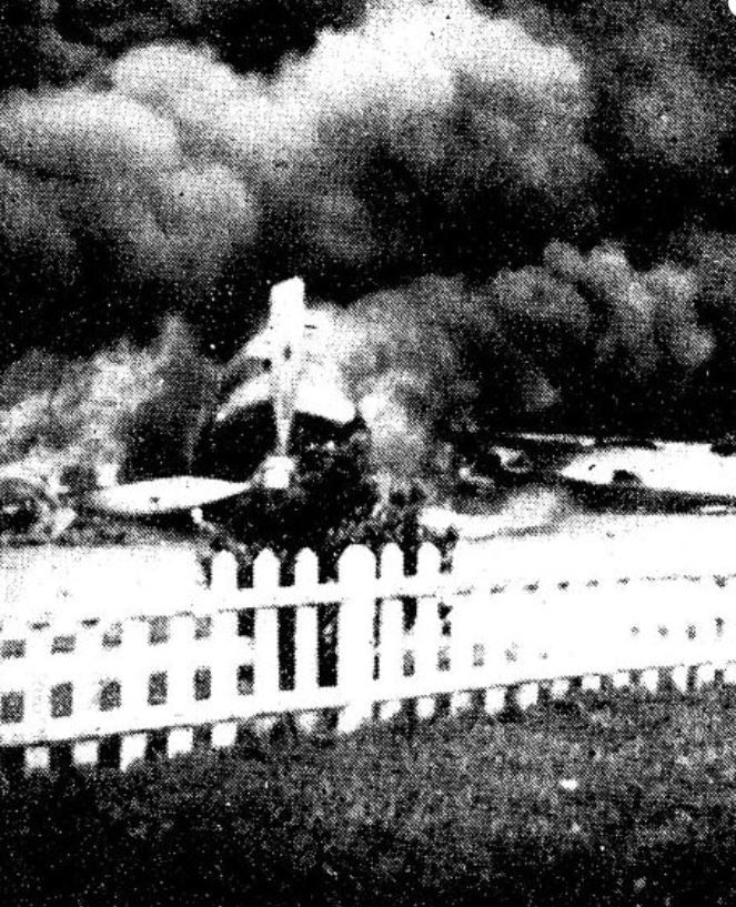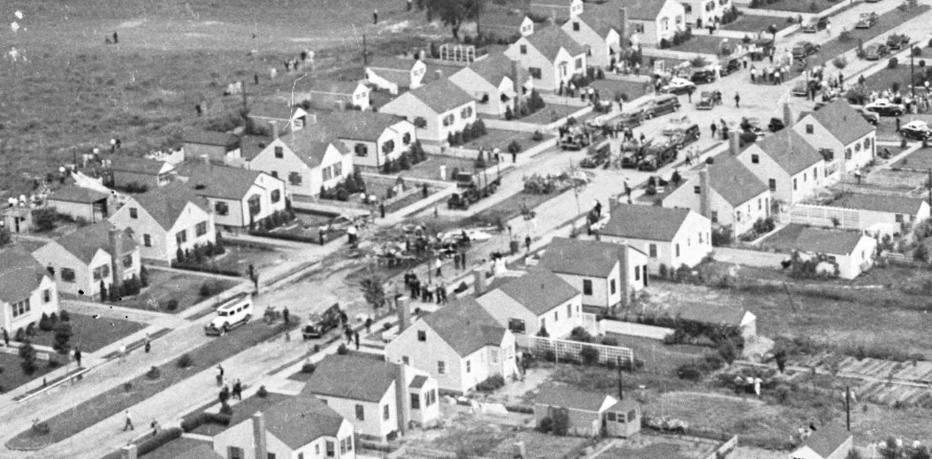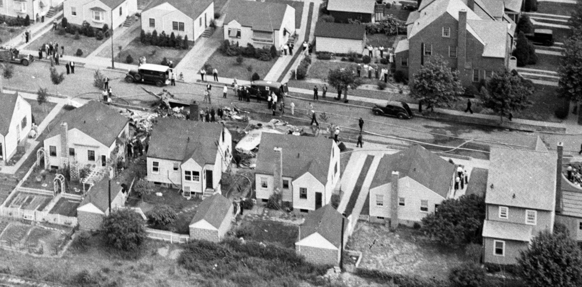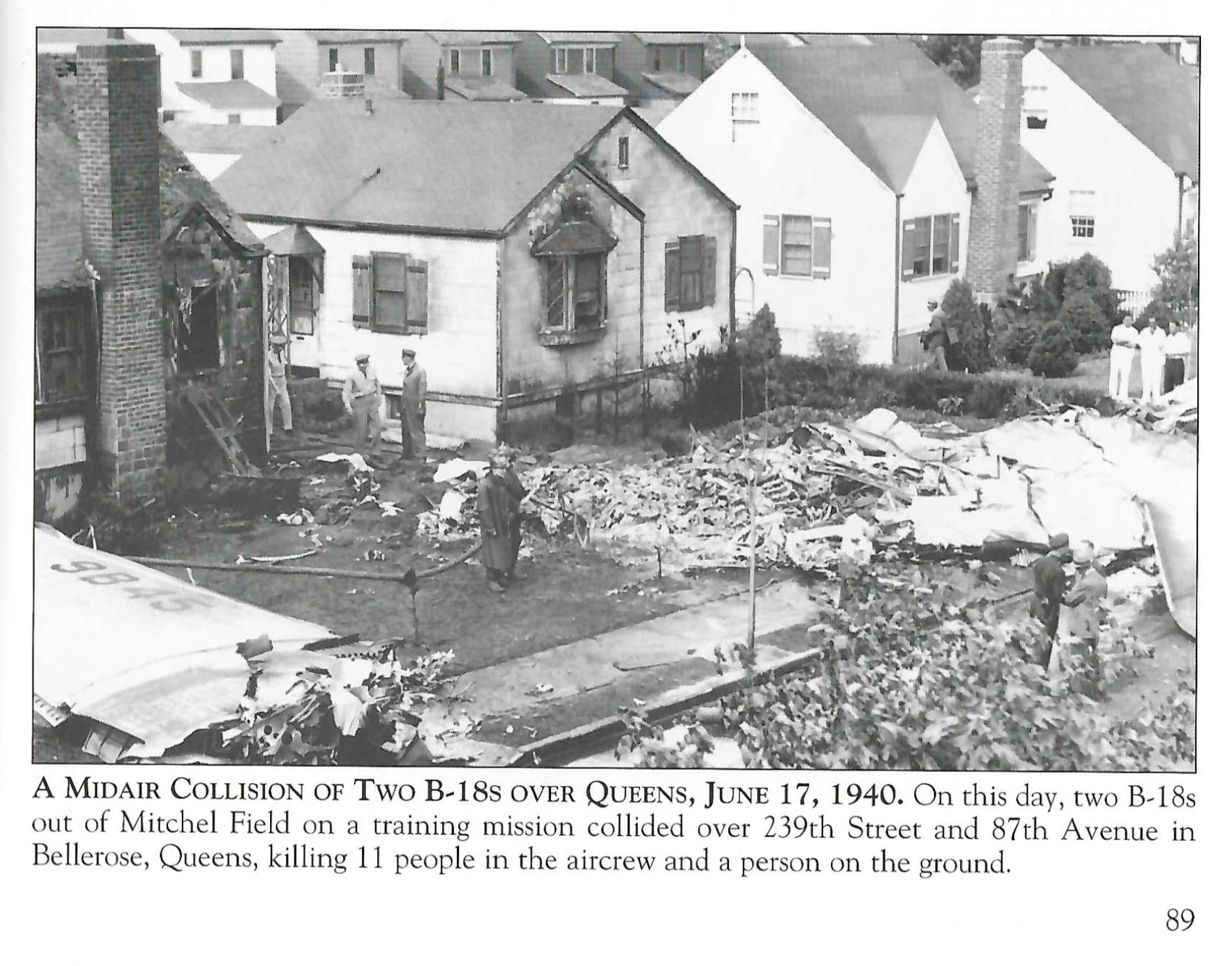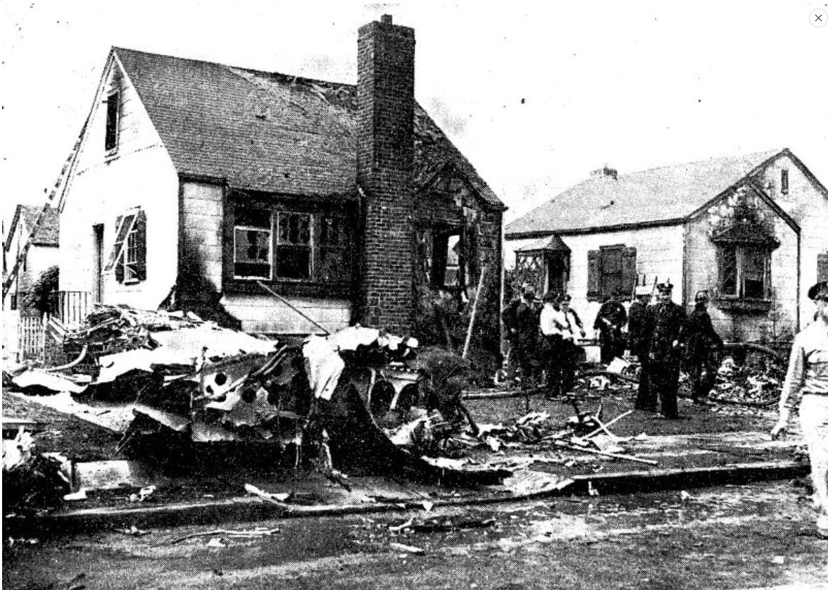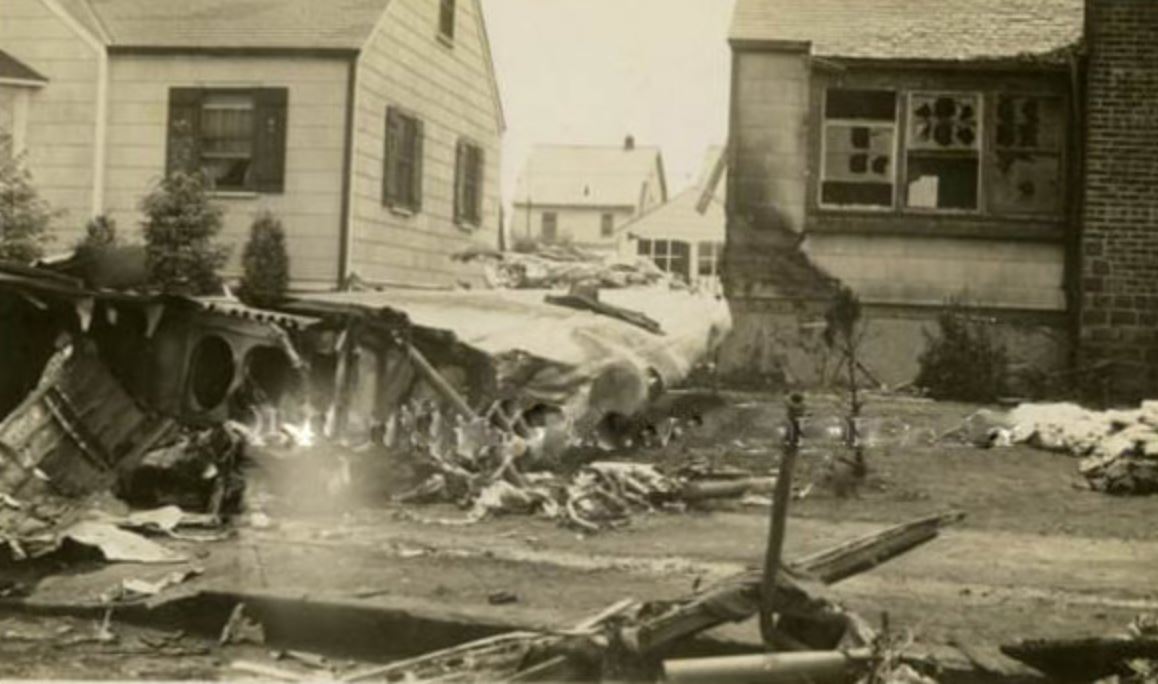 The tragic event: Two B-18 bombers from Mitchel Field collided during a training exercise, raining debris and fuel over the neighborhood of newly-built homes. All 11 men aboard the planes were killed, and a woman on the ground suffered burns from fuel that ignited her home and died the next day.