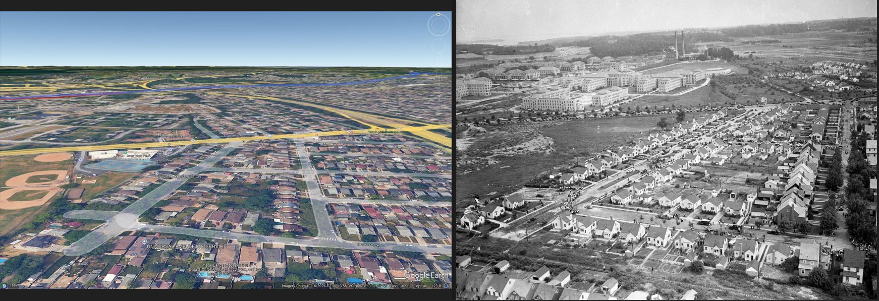 The Motor Parkway is barely visible towards the top of the Foto. I see the bridge over the Cross Island Parkway, which would open a few days later. The road in the middle of the Foto, which separates the neighborhood from the hospital, is Hillside Avenue.