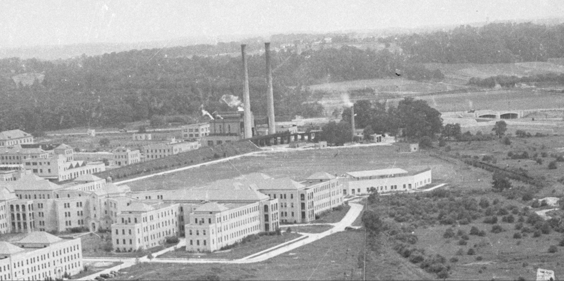 Creedmoor Hospital. Seen by the Creedmoor facility is a railroad siding that supplied coal to the power plant.