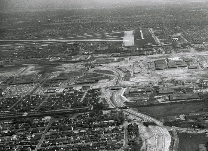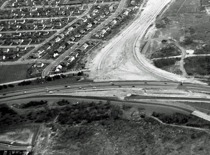 Northern State Parkway, looking South at the Meadowbrook Parkway being constructed, with Mitchell Field in the background.