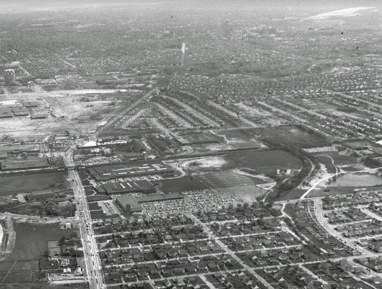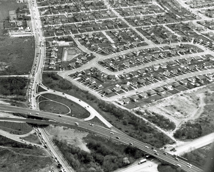 Looking south. The unfinished Meadowbrook is coming alive as an exit off the Northern State Pkwy. You can see a peak of Jericho Tpke, Roosevelt Field, Carle Place streets, and even the LIMP too.